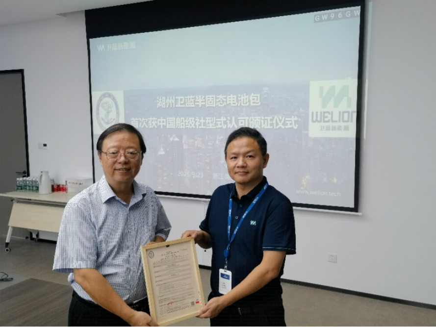 2025年9月23日,在湖州卫蓝科技有限公司的系统集成车间内,举行了一场具有里程碑意义的颁证仪式。卫蓝新能源旗下产品——湖州卫蓝半固态电池包成功获得中国船级社(CCS)颁发的首张型式认可证书。这不仅标志着卫蓝新能源在半固态电池技术应用领域取得了新的重大突破,也意味着该产品已完全满足船舶应用严苛的安全和技术标准,为推动我国绿色航运和湖州市船舶电动化工作注入了强劲新动力。