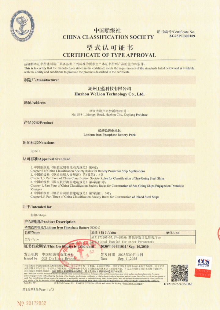 这张证书的取得,表明卫蓝新能源半固态电池包在安全性、可靠性、环境适应性及循环寿命等方面,均已通过中国船级社的全面且严格的检测与评估,达到了船舶动力电池的最高准入水平。